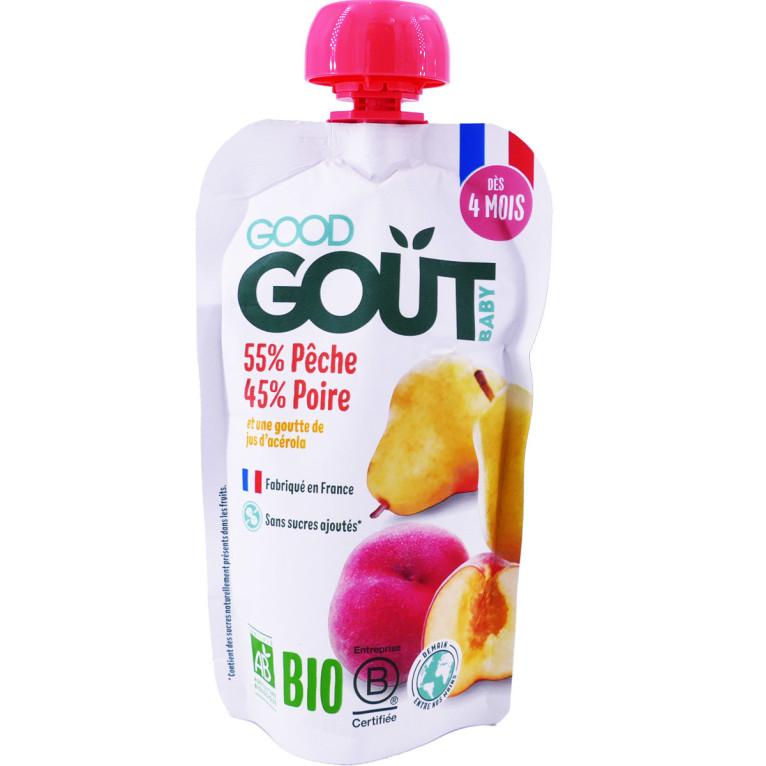 Découvrez la nouvelle marque française d’alimentation biologique sans produits chimiques ni pesticides ni OGM, à base de fruits et de légumes savoureux : GOOD GOUT. Spécialisée dans la conception de produits délicieux, GOOD GOUT vous assure qualité nutritionnelle, saveurs naturelles et plaisirs gustatifs pour régaler les enfants dès le plus jeune âge ! Lorsque vient l’âge de la diversité alimentaire, Bébé est avide de nouvelles saveurs et de textures différentes. Les Gourdes Purée de fruit Bio qui ne contiennent pas de sucres ajoutés ni autres ingrédients nocifs, régaleront les papilles des plus jeunes ! Onctueuses, elles contiennent seulement des Pêches Bio et de la Poire williams Bio, qui plairont aux enfants. En gourde, la purée de Pêches Bio et de Poires williams Bio s’emporte partout avec soi pour répondre aux envies gourmandes des petits ! 55% de Pêches et 45% de Poires. Sans sucres ajoutés.