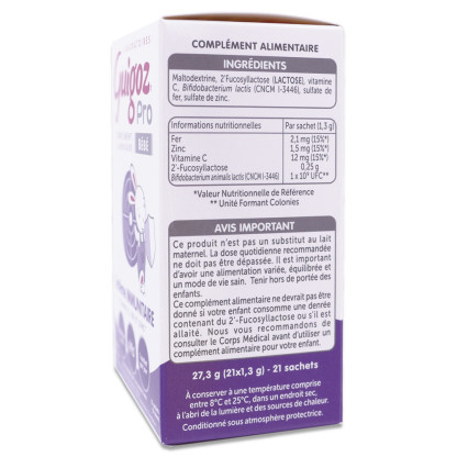 Maltodextrine, 2'Fucosyllactose (LACTOSE), vitamine C, Bifidobacterium lactis (CNCM I-3446), sulfate de fer, sulfate de zinc.Informations nutritionnelles (par sachet de 1,3 g) : Fer : 2,1 mg (15%*) ; Zinc : 1,5 mg (15%*) ; Vitamine C : 12 mg (15%*) ; 2'-Fucosyllactose : 0,25 g ; Bifidobacterium animalis lactis (CNCM I-3446) : 1x109 UFC**.