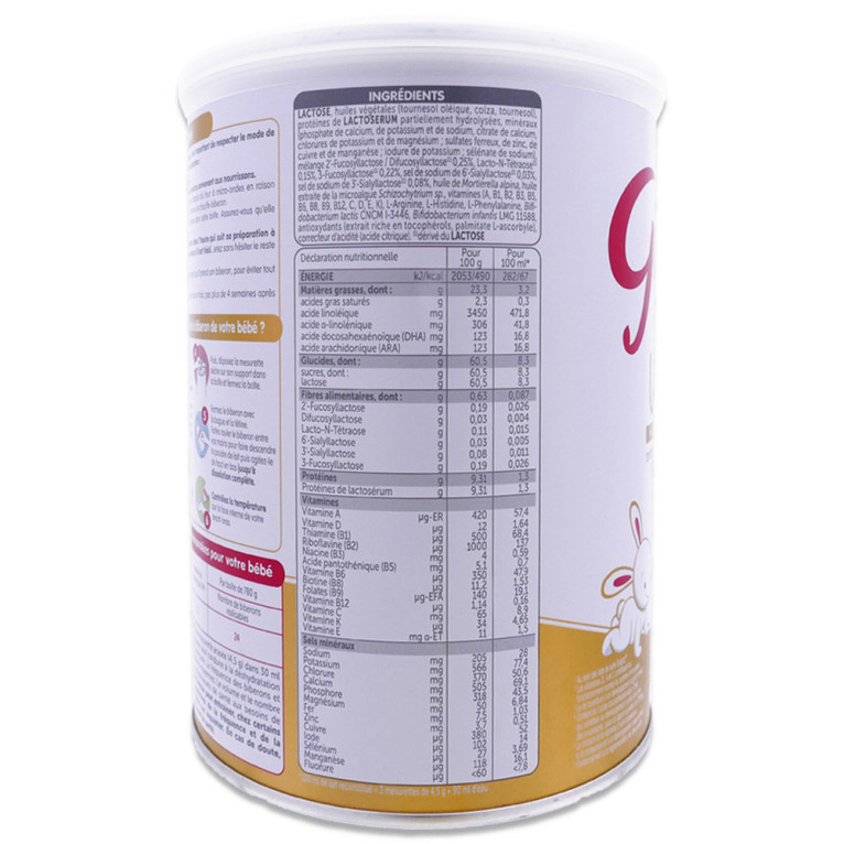 LACTOSE, huiles végétales (tournesol oléique, colza, tournesol), protéines de LACTOSERUM partiellement hydrolysées, minéraux (phosphate de calcium, de potassium et de sodium, citrate de calcium, chlorures de potassium et de magnésium ; sulfates ferreux, de zinc, de cuivre et de manganèse ; iodure de potassium ; sélénate de sodium), mélange 2'-Fucosyllactose / Difucosyllactose (1) 0,25%, Lacto-N-Tétraose (1) 0,15%, 3-Fucosyllactose (1) 0,22%, sel de sodium de 6'-Sialyllactose (1) 0,03%, sel de sodium de 3'-Sialyllactose (1) 0,08%, huile de Mortierella alpina, huile extraite de la microalgue Schizochytrium sp., vitamines (A, B1, B2, B3, B5, B6, B8, B9, B12, C, D, E, K), L-Arginine, L-Histidine, L-Phenylalanine, Bifidobacterium lactis CNCM I-3446, Bifidobacterium infantis LMG 11588, antioxydants (extrait riche en tocophérols, palmitate L-ascorbyle), correcteur d'acidité (acide citrique).