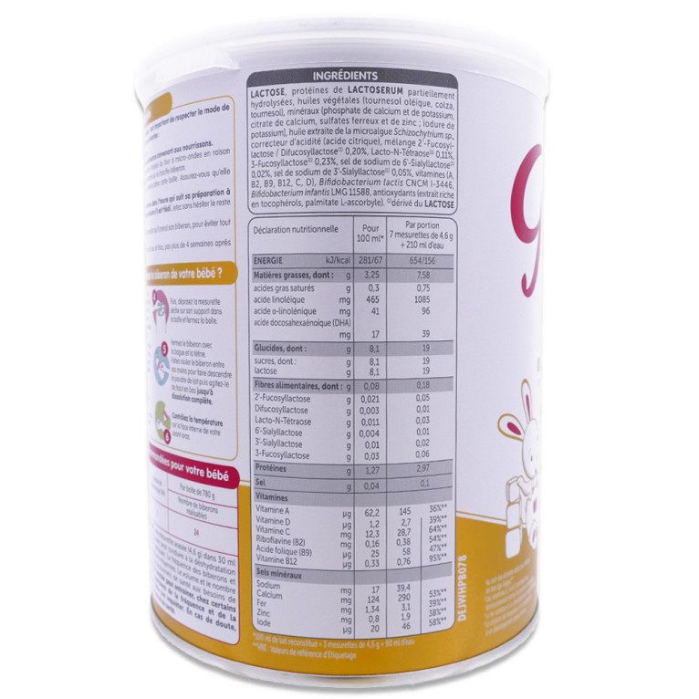 LACTOSE, protéines de LACTOSERUM partiellement hydrolysées, huiles végétales (tournesol oléique, colza, tournesol), minéraux (phosphate de calcium et de potassium, citrate de calcium, sulfates ferreux et de zinc ; iodure de potassium), huile extraite de la microalgue Schizochytrium sp., correcteur d'acidité (acide citrique), mélange 2'-Fucosyllactose / Difucosyllactose (1) 0,20%, Lacto-N-Tétraose (1) 0,11%, 3-Fucosyllactose (1) 0,23%, sel de sodium de 6'-Sialyllactose (1) 0,02%, sel de sodium de 3'-Sialyllactose (1) 0,05%, vitamines (A, B2, B9, B12, C, D), Bifidobacterium lactis CNCM I-3446, Bifidobacterium infantis LMG 11588, antioxydants (extrait riche en tocophérols, palmitate L-ascorbyle).