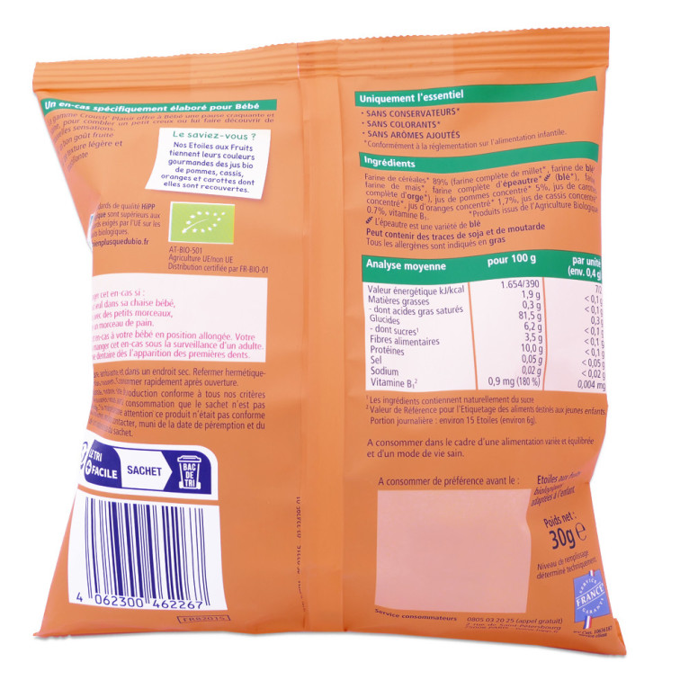Farine de céréales* 89% (farine complète de millet*, farine de BLE*, farine de maïs*, farine complète d'EPEAUTRE* (BLE*), farine complète d'ORGE*), jus de pommes concentré* 5%, jus de carottes concentré*, jus d'oranges concentré* 1,7%, jus de cassis concentré* 0.7%, vitamine B1.