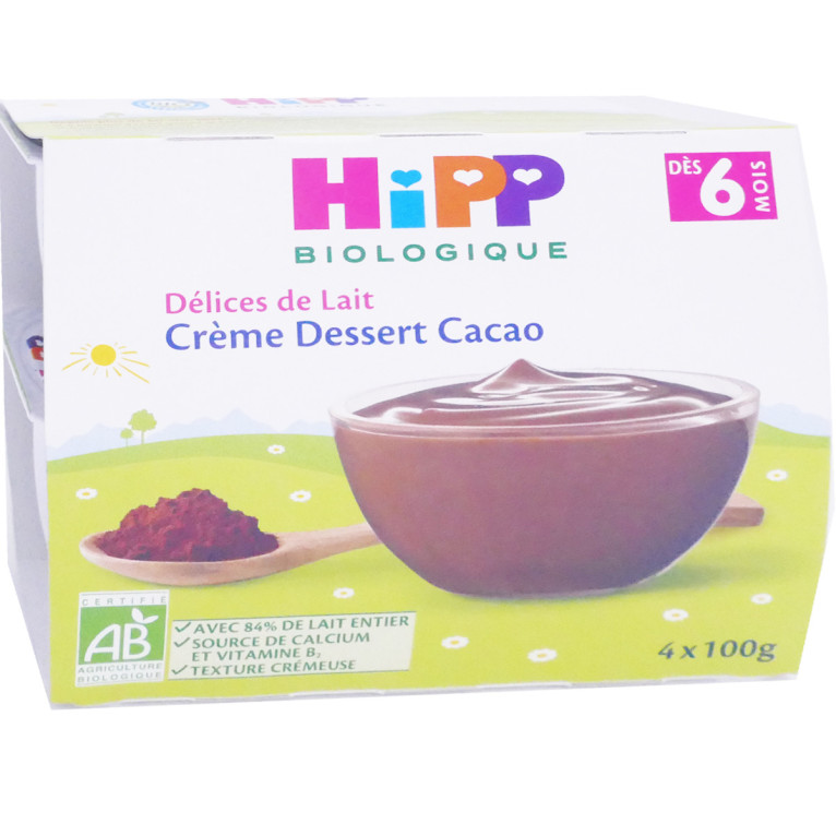 Délices de Lait discount de HiPP Biologique, démarrer la diversification alimentaire en douceur dans votre parapharmacie en ligne à prix discount, avec ces crèmes desserts gourmandes pour faire découvrir de nouvelles saveurs aux bébés, dès 6 mois Cacao