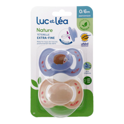 La sucette Anatomique Nature 0-6 mois de Luc et Léa à prix discount, un univers de fantaisie pour les bébés dans votre parapharmacie en ligne discount, dans deux sucettes conçues pour chuchoter des petits mots doux. Coloris et motifs selon disponibilité