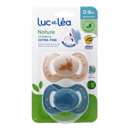 La sucette Anatomique Nature 0-6 mois de Luc et Léa à prix discount, un univers de fantaisie pour les bébés dans votre parapharmacie en ligne discount, dans deux sucettes conçues pour chuchoter des petits mots doux. Coloris et motifs selon disponibilité