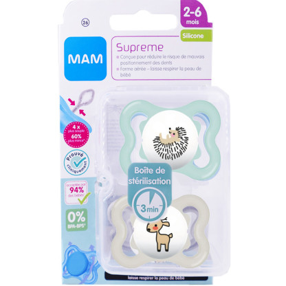 Les sucettes MAM accompagnent les bébés en satisfaisant leur réflexe de succion et en leur procurant un sentiment d’apaisement. Les sucettes MAM sont conçues pour garantir un maximum de confort aux bébés pendant les différentes phases de leur développement. Leur design anatomique assure une parfaite prise en bouche, le respect du développement de la mâchoire et de la bonne disposition dentaire. Les tétines Suprême en silicone SkinSoft™ ultra-doux comme la peau, offrent une bonne stabilité en bouche. La sucette Suprême 2-6 mois de MAM, ultra-fine (60% plus mince et 4 fois plus souple qu’une sucette classique), a été spécialement conçue en collaboration avec des orthodontistes et dentistes pédiatriques afin de minimiser au maximum le risque de mauvais positionnement dentaire. Sa collerette évasée à très larges ouvertures préserve la peau fragile des bébés et n’entrave pas la respiration. La sucette est munie d’un boitier de stérilisation qui facilite son transport et sa stérilisation au micro-ondes simple et ultra-rapide.