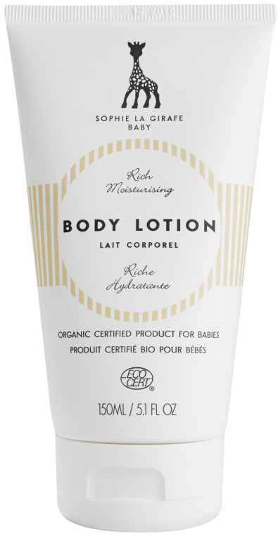 Le lait corporel de SOPHIE LA GIRAFE, le soin douceur des peaux sensibles des bébés dès la naissance pour adoucir, protéger et hydrater le corps.