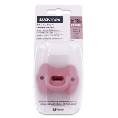 SUAVINEX SUCETTE SILICONE SMOOTHIE BUTTERFLY 6-18MOIS ROSE est en vente en ligne sur le site de votre parapharmacie à prix discount, conçue pour apaiser les besoins de succion des bébés de 6 à 18 mois.