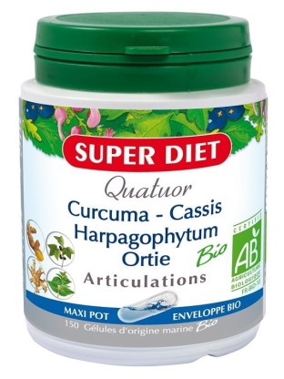 QUATUOR Articulations Curcuma Cassis Harpagophytum Ortie de SUPER DIET , le complément alimentaire sous forme de gélules dans votre parapharmacie en ligne à prix discount.