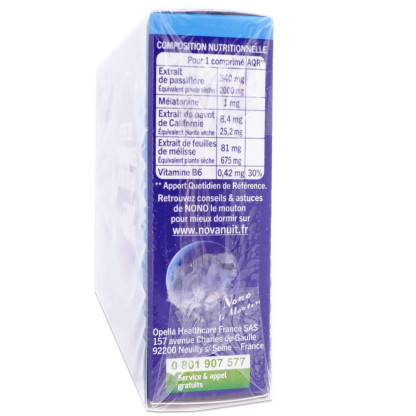 NOVANUIT Triple action est un complément alimentaire sous forme de comprimés qui contient de la mélatonine, hormone du sommeil, sécrétée naturellement par le cerveau, et des extraits de plantes 100% d’origine végétale comme la passiflore, le pavot de Californie et la mélisse pour des actions sur l’endormissement, la diminution des réveils nocturnes et le sommeil réparateur. La mélatonine, à un dosage de 1mg, favorise un sommeil normal et participe à s'endormir de façon naturelle. De plus, la mélisse et le pavot de Californie participent à améliorer la qualité du sommeil. La passiflore s’associe à la formule pour favoriser un sommeil réparateur. Ce complément alimentaire permet par sa technologie de libération de libérer 5 fois plus rapidement la mélatonine par rapport à l’ancien comprimé NOVANUIT. Sans accoutumance ni dépendance.