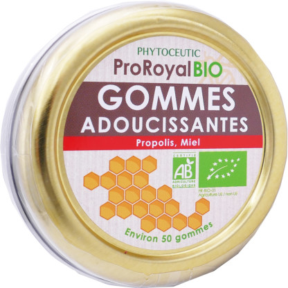 Gommes adoucissantes de ProRoyal Bio est conditionné sous forme de gommes à mâcher, composées de propolis que les abeilles récoltent pour protéger leur ruche ainsi que de miel.