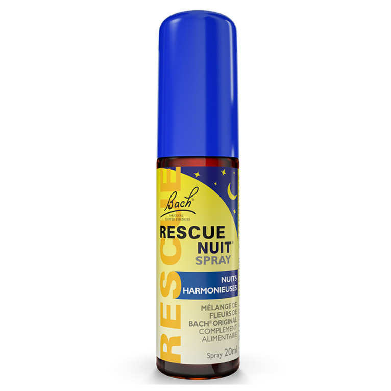 100% naturel, Rescue Nuit spray est un complément alimentaire sous forme de spray composé de 6 fleurs de Bach Original cueillies à la main dans les jardins originaux d’Edward Bach. Ces 6 Fleurs de Bach originales sont diluées dans une solution hydroalcoolique à vaporiser dans la bouche pour participer à des nuits harmonieuses. La marque Rescue porte la signature d’Edward Bach qui est la garantie d’un produit original et authentique.