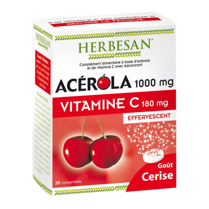 ACEROLA 1000 mg VITAMINE C Effervescent d’HERBESAN, un concentré d’apport en Vitamine C qui contribue à réduire la fatigue dans un complément alimentaire en comprimé effervescent au goût de cerise dans votre parapharmacie discount en ligne