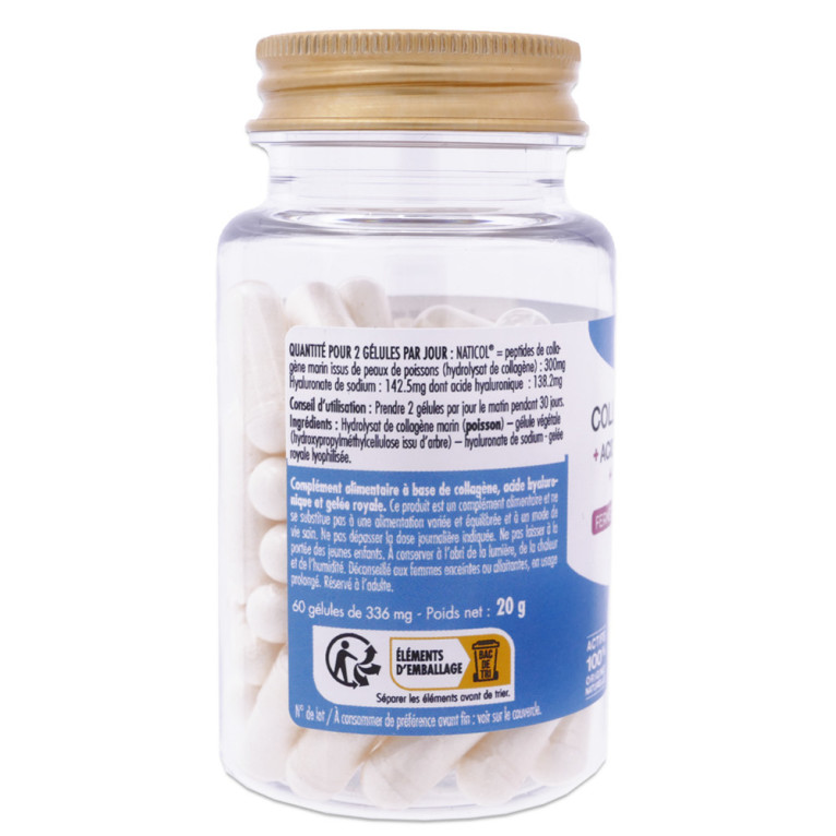 Hydrolysat de collagène marin (POISSON) - gélule végétale (hydroxypropylméthylcellulose issu d'arbre) - hyaluronate de sodium - gelée royale lyophilisée.