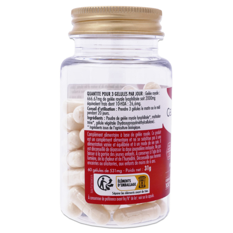 Ingrédients : Poudre de gelée royale lyophilisée*, maltodextrine*, gélule végétale (hydroxypropylméthylcellulose).*Ingrédients issus de l'agriculture biologique.
