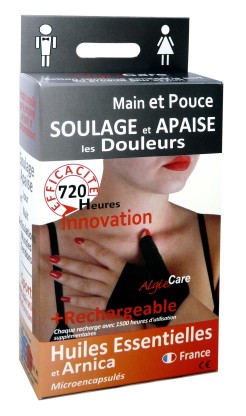 ALGIE Care sont des solutions naturelles à base d’huiles essentielles et d’extrait d’arnica micro encapsulées, sous forme d’orthèse, genouillère, tee-shirt,… pour soulager diverses douleurs par des fibres synthétiques en polyester. L’orthèse est composée d’une fibre polyester qui contient de la zircone (oxyde de zirconium) à l’effet thermique en nano-particules d’oxyde de zirconium fixé sur le tissu, des microcapsules composées d’huile essentielle de gaulthérie et des extraits d’arnica pour des actions antalgiques et antiinflammatoires. En se libérant au contact de la peau par frottements et en compressant légèrement sur la main et le pouce, ces actifs d’origine 100% naturels micro encapsulés vont soulager les douleurs instantanément au niveau de la main pour retrouver de la mobilité sans souffrance. L’orthèse de couleur noire peut être portée jour et nuit pour une efficacité longue durée, avant pendant ou après un effort. L’orthèse est efficace pendant 720 heures même si elle n’est pas portée en continu. Rechargeable avec la solution en spray ALGIE, l’orthèse du poignet est réutilisable à volonté. Elle peut être lavée à 40°C pour une utilisation longue durée et être séchée sur cintre.