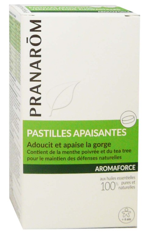 Le laboratoire PRANAROM conçoit des produits d’aromathérapie et compléments alimentaires à base d’huiles essentielles pures et naturelles et de plantes naturelles pour retrouver le bien-être au quotidien. Aromaforce Pastilles apaisantes gorge est un complément alimentaire sous forme de pastilles à base d’huiles essentielles 100% pures et naturelles (Lime, Cajeput, Menthe poivrée, Tea-tree, Sarriette des montagnes, Laurier noble, Cannelle de Ceylan, Giroflier) aux propriétés calmantes pour apaiser et adoucir les maux de gorge ou d’enrouements sur la voix.