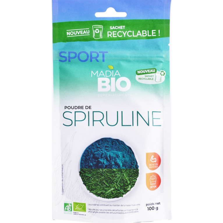 Poudre de Spiruline bio discount de Madia Sport, une poudre riche en protéines végétales pour contribuer au maintien de la masse musculaire et riche en fer pour contribuer au fonctionnement normal du système immunitaire, dans votre parapharmacie en ligne à prix pas cher.