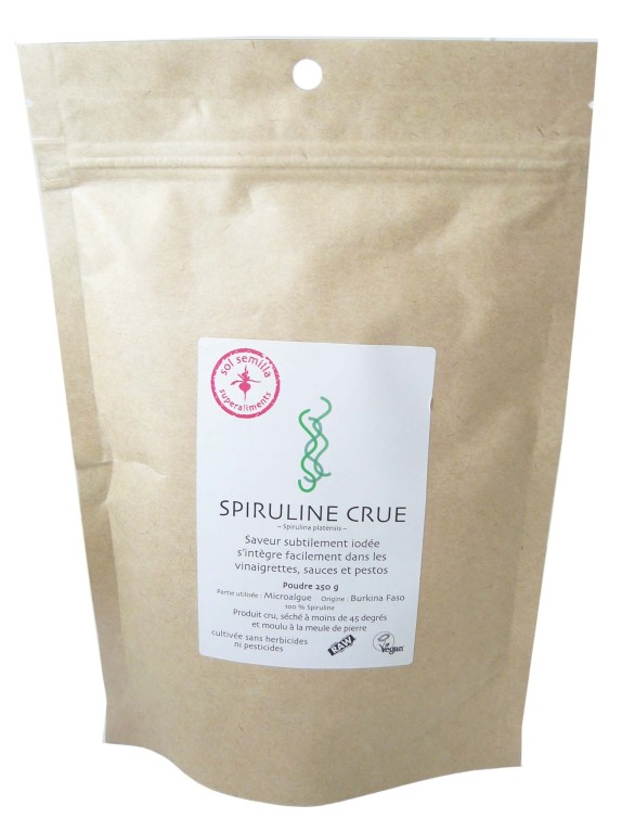 Le laboratoire SOL SEMILLA offre des aliments issus du monde entier, d’une grande qualité, adapté aux besoins de l’organisme et consommés depuis la nuit des temps : cacao, maca, caroube, lucuma, guarana, spiruline...Sol Semilla Spiruline Crue Bio est une micro algue bleue aux multiples bienfaits, riche en protéines végétales, acides aminés, vitamines, minéraux, oligo-éléments et pigments (chlorophylle, phycocyanines et caroténoïdes). Ce super aliment est spécialement formulé pour protéger l’organisme des agressions, renforcer ses défenses naturelles et redonner énergie, tonus et vitalité naturellement.