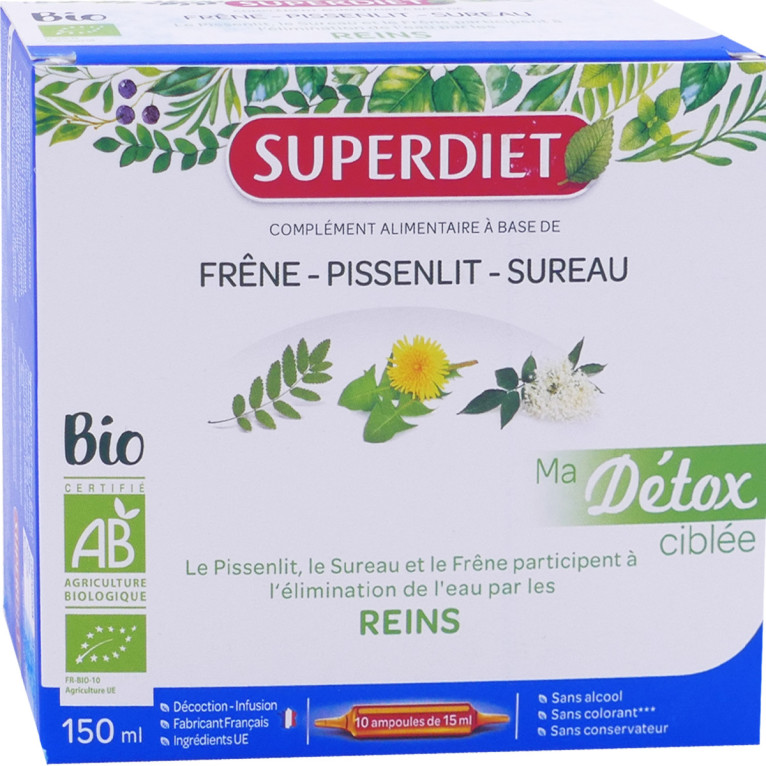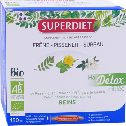 Détox Reins Bio des laboratoires SUPERDIET, est un complément alimentaire à base de frêne et de pissenlit, qui contribuent à l'élimination de l'eau , et de sureau, qui aide à une fonction excrétrice normale des reins.