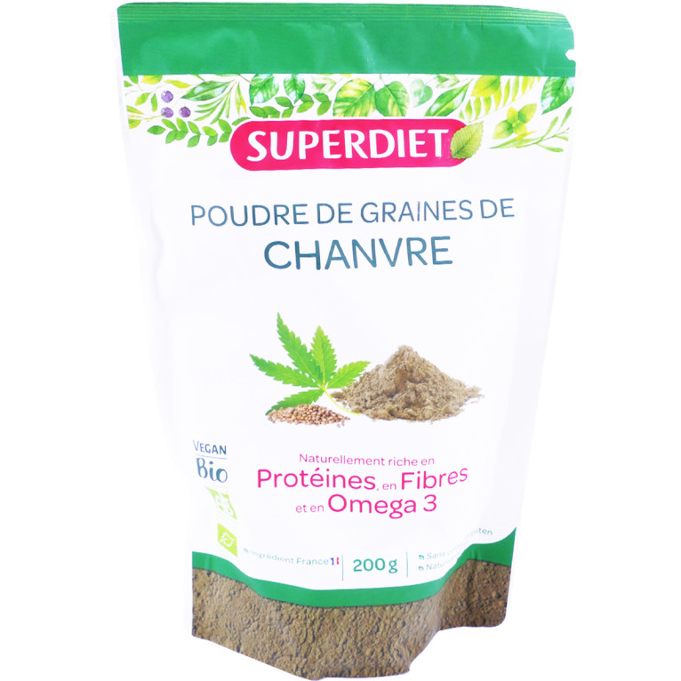 Poudre de Graines de Chanvre Bio de SUPERDIET, est conditionné en sachet souple. La poudre de graines de chanvre est naturellement riches en fibres, riches en protéines et riche en oméga 3. Cette poudre apporte 87mg par portion journalière d'acide alphalinolénique. Cette poudre est à mélanger et diluer dans un aliment comme le yaourt par exemple.