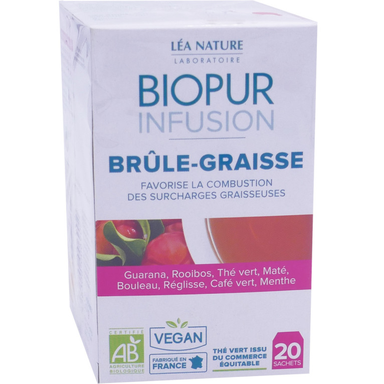 BIOPUR est une marque du laboratoire LEA NATURE composée de compléments alimentaires, super-aliments, thés et infusions fabriqués en France, à base d’actifs naturels et biologiques labellisé AB et vegan. BIOPUR Brûle-graisses est une infusion composée de guarana qui contribue au métabolisme des graisses et aide à combattre les excès de poids, de thé vert qui aide à brûler les graisses, de bouleau qui favorise l'élimination et l’amincissement et de maté qui contribue à la dégradation des lipides. Cette délicieuse infusion aromatisée contient également du Rooibos, de la Réglisse, du Café Vert et de la Menthe.