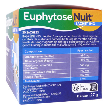 Les infusions Euphytose Nuit sont des compléments alimentaires à base de mélatonine, de camomille, de tilleul, de sauge et de menthe poivrée.La mélatonine est l’hormone du sommeil sécrétée naturellement par le cerveau.Cette dernière à un dosage de 1mg favorise un sommeil normal, participe à s'endormir de façon naturelle.Elle contribue également à la réduction des effets du décalage horaire dès 0.5mg. La camomille favorise la relaxation, de plus le tilleul contribue également au sommeil.ce complément alimentaire s'utilise en usage ponctuel ou bien sur un programme de 20 jours.