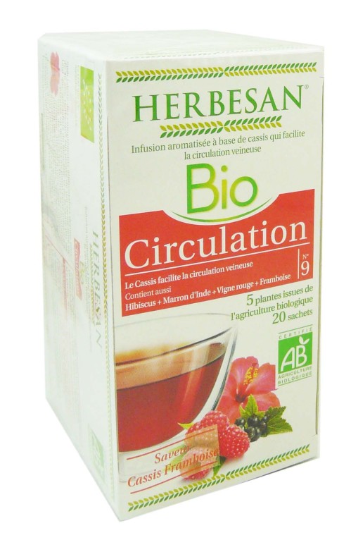 HERBESAN développe depuis plus de 40 ans des compléments alimentaires composés d’extraits de plante et d’actifs issus de la nature pour apporter une réponse naturelle à tous les besoins santé et bien-être. La gamme des INFUSIONS certifiées BIO est composée de produits spécialement conçus pour offrir un moment de plaisir et de bien-être nature. Infusion Bio Circulation d’HERBESAN est une infusion à base de plantes issues de l’agriculture biologique, sélectionnées pour leur capacité à améliorer la circulation sanguine, favoriser le drainage de l’organisme et l’élimination des excès liquidiens, rétablir la légèreté : cassis, hibiscus, vigne rouge, marron d’inde et framboise. Cette infusion bien-être garantit également un véritable moment de plaisir grâce à la saveur de son arôme naturel de cassis-framboise.