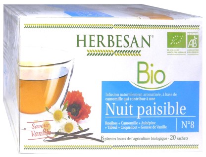 Le laboratoire HERBESAN conçoit des compléments alimentaires et médicaments à base de plantes et nutriments pour assurer le bien-être quotidien (digestion, infusion, vitamines,…). L’infusion Nuit paisible à base de 6 plantes bio va favoriser l’endormissement en apaisant et relaxant mentalement et physiquement, permettre de s’endormir sereinement, et participer au bon équilibre nerveux à l’équilibre organoleptique du phytocomplexe. Rapidement, ses bienfaits se ressentent : le mental s’apaise pour une nuit réparatrice en toute sérénité ! Son délicieux goût fera de cette infusion un vrai plaisir à boire !
