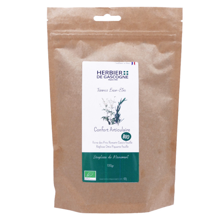 Le laboratoire Herbier de Gascogne propose des produits de phytothérapie et aromathérapie (compléments alimentaires, tisanes, cosmétiques) à base exclusivement de produits naturels traditionnels et bio pour le bien-être au quotidien. La tisane Confort articulaire bio du laboratoire Le comptoir de l’Apothicaire est une tisane à base de plantes naturelles bio (cassis, Ortie, Myrtille, Réglisse, Reine des Près, Romarin) qui va apaiser les douleurs des articulations et permettre de retrouver de la souplesse.