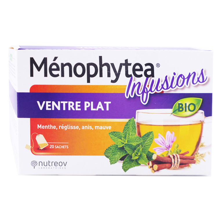 MÉNOPHYTEA SILHOUETTE VENTRE PLAT INFUSION discount des laboratoires NUTREOV, une délicieuse infusion Bio en sachet individuel, à base d’actifs d’origine végétale bio dont la menthe poivrée qui contribue au confort digestif, dans votre parapharmacie en ligne à prix discount.