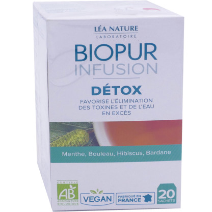 BIOPUR est une marque du laboratoire LEA NATURE composée de compléments alimentaires, super-aliments, thés et infusions fabriqués en France, à base d’actifs naturels et biologiques labellisé AB et vegan. BIOPUR Détox est une infusion Vegan, fabriqué en France. Elle est composée de bardane qui favorise l’élimination rénale de l'eau, de Bouleau qui soutient les fonctions excrétrices des reins et de menthe poivrée qui contribue à la relaxation et au maintien d'un sommeil naturel, soutient le système immunitaire et aide à soutenir une digestion saine en contribuant au fonctionnement normal du transit intestinal. Cette délicieuse infusion aromatisée contient également de l’hibiscus.