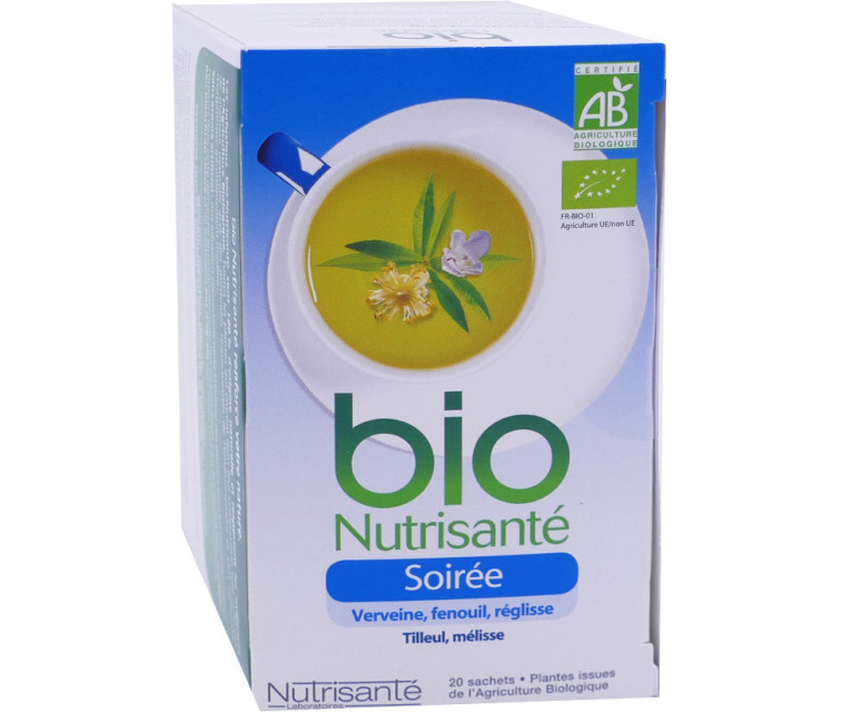 Depuis 1992, Les laboratoires NUTRISANTE proposent aux consommateurs en quête de bien-être des produits innovants, efficaces, naturels pour l’organisme à travers des gammes complètes de compléments nutritionnels, tisanes et infusions. Les infusions Nutrisanté 100% d’origine naturelle, sont formulées avec des plantes cultivées conformément aux exigences de l’agriculture biologique, dans le respect de l’environnement et sans utilisation d’OGM. Ces infusions conservent la pureté des plantes et sont garanties sans arôme artificiel. Les sachets-filtres sont élaborés avec du papier non blanchi au chlore et ne possèdent pas d’agrafe afin d’éviter tout phénomène d’oxydation. L’infusion NUTRISANTE Soirée est composée de tilleul et de mélisse qui complètent cette infusion par leurs arômes uniques, mais aussi de verveine qui aide à trouver un meilleur sommeil et à diminuer l'irritabilité et de fenouil qui participe à soutenir la digestion.