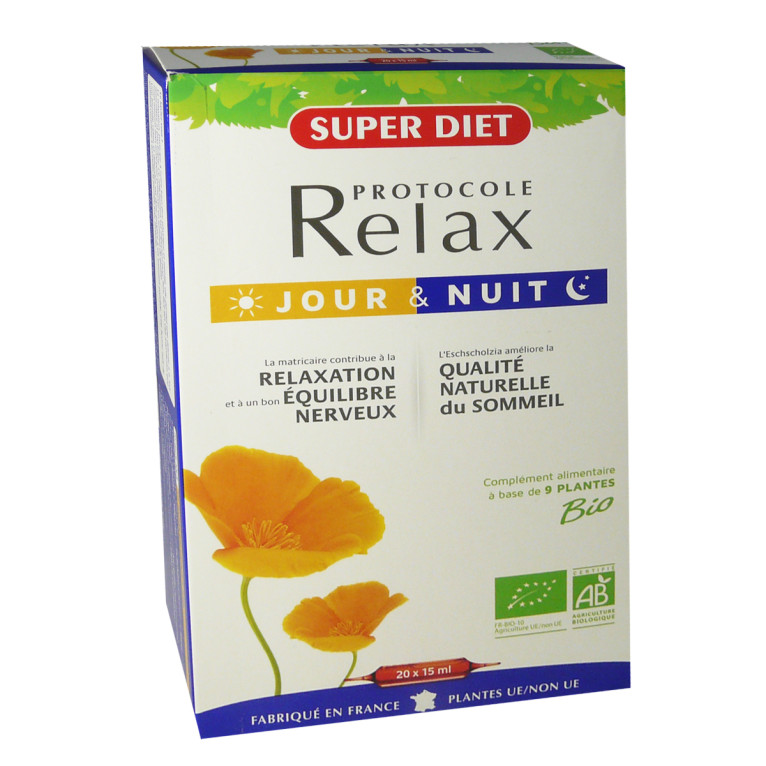 SUPERDIET propose une large gamme de compléments alimentaires à la fois efficaces et sûrs, élaborés avec des plantes issues majoritairement de l’agriculture biologique, pour offrir le meilleur de la nature et apporter des solutions naturelles à tous nos besoins santé et bien-être. Protocole Relax, est un programme sur 10 jours, qui va permettre d’agir le jour et la nuit sur la détente, la relaxation et le bien-être physique et mental. Sous forme d’ampoules à boire, ces 2 compléments alimentaires bios (Jour et Nuit) vont agir sur le bien-être du corps et de l’esprit afin de détendre complètement, retrouver de la sérénité et l’équilibre nerveux et mental, et aider à bien dormir pour une meilleure qualité de sommeil grâce aux extraits de plantes bio (matricaire, millepertuis, Escsholzia, rhodiole, ornager, passiflore, angélique, aubépine). Protocole Relax va permettre de retrouver des journées calmes et sereines et un sommeil de qualité en 10 jours.