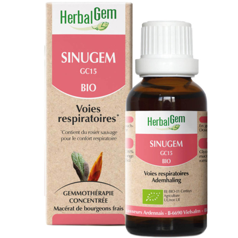 La marque HERBALGEM est composée de compléments alimentaires de gemmothérapie et concentre l’énergie des bourgeons naturels et jeunes pousses rigoureusement contrôlés pendant toutes les phases de fabrication. Sinugem de Herbalgem est composé de 4 extraits de bourgeons bio (aulne glutineux, cassis, charme, rosier sauvage). L'aulne glutineux participe au soutien du système immunitaire et le charme contribue à une respiration aisée et au fonctionnement normal des bronches et poumons.