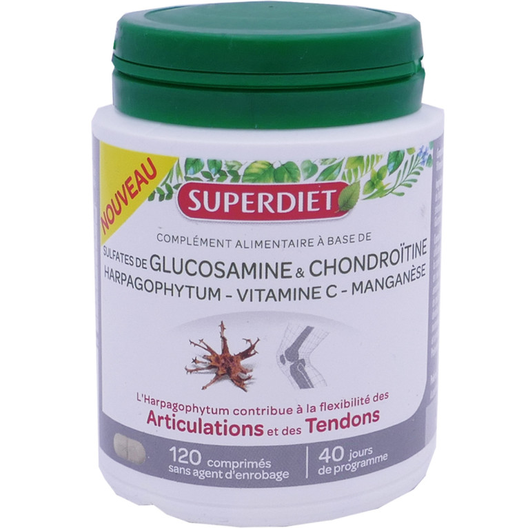 SUPERDIET propose une large gamme de compléments alimentaires à la fois efficaces et sûrs, élaborés avec des plantes issues majoritairement de l’agriculture biologique, pour offrir le meilleur de la nature et apporter des solutions naturelles à tous nos besoins santé et bien-être. ARTICULATIONS et TENDONS, conditionné en comprimés, est un complément alimentaire destiné à améliorer le confort des articulations et des tendons grâce à la combinaison de plante, vitamines et minéraux (harpagophytum, vitamine C, manganèse, glucosamine, chondroïtine dont l’association contribue à développer la souplesse et la mobilité articulaire et tendineuse, assurer la formation normale des os et des cartilage ainsi que des tissus conjonctifs.