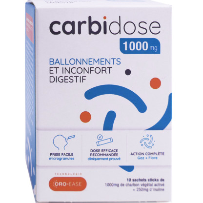 CARBIDOSE 1000 des laboratoires EUPEPTIS est destiné à être utilisé pour aider à : réduire les ballonnements après les repas. Sa formule brevetée cliniquement prouvée est à base de charbon végétal activé fortement dosé (1000mg par stick*), et d’inuline. Le charbon actif participe à diminuer les flatulences. L’inuline qui provient de la racine de la chicorée complète la formule. Conditionné en sachets stick, CARBIDOSE 1000 en micro granules orodispersibles permet une prise facile.
