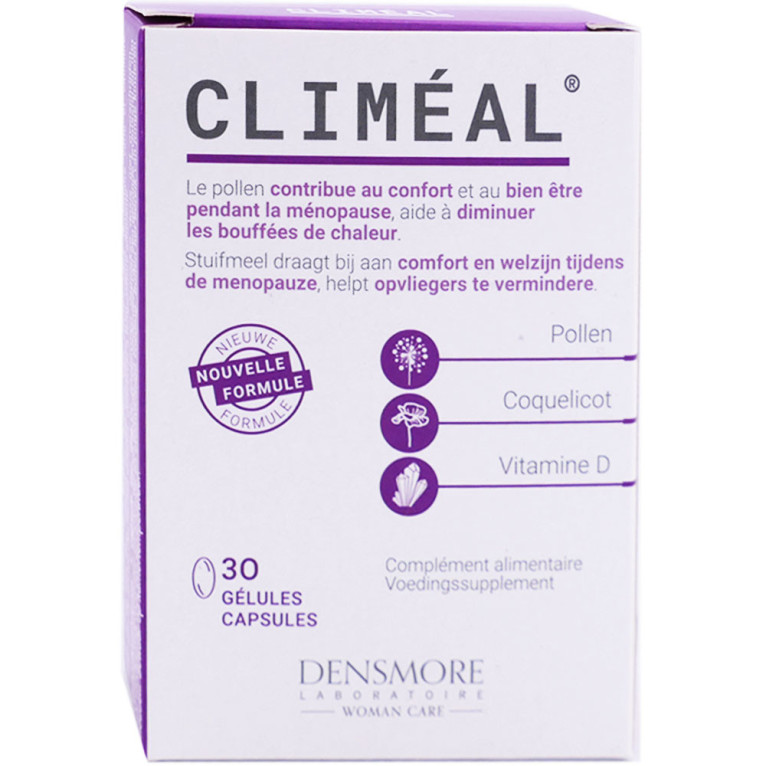 CLIMEAL Ménopause discount des laboratoires DENSMORE, un complément alimentaire en gélules qui s’adresse aux femmes ménopausées à base de coquelicot et vitamine, et pollen qui contribue au confort pendant la ménopause, dans votre parapharmacie en ligne à prix discount.