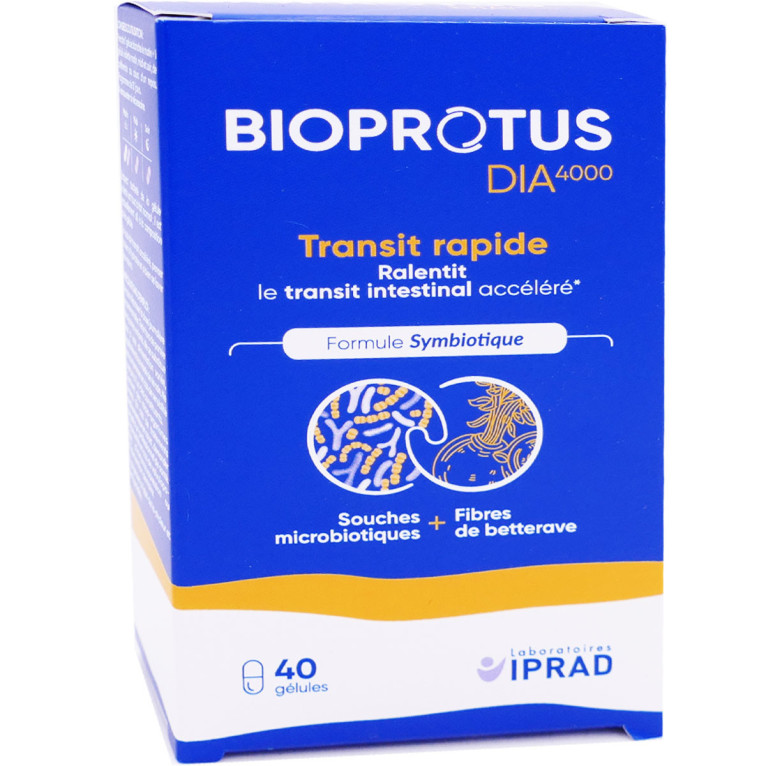Depuis 1989, les Laboratoires IPRAD développent des produits de santé et de bien-être, formulés de façon à offrir efficacité et sécurité grâce à une sélection rigoureuse des actifs les plus doux possibles pour l’organisme. Bioprotus DIA 4000 Transit Rapide est un complément alimentaire composé d’un complexe de 2 souches de ferments lactiques (3 milliards pour 4 gélules) qui sont des micro-organismes vivants naturellement présents dans les intestins, et de fibres nutritives issus de la betterave (fructo-oligo saccharides) ainsi que des baies de myrtille qui contribuent à réguler (ralentir) le transit intestinal accéléré.