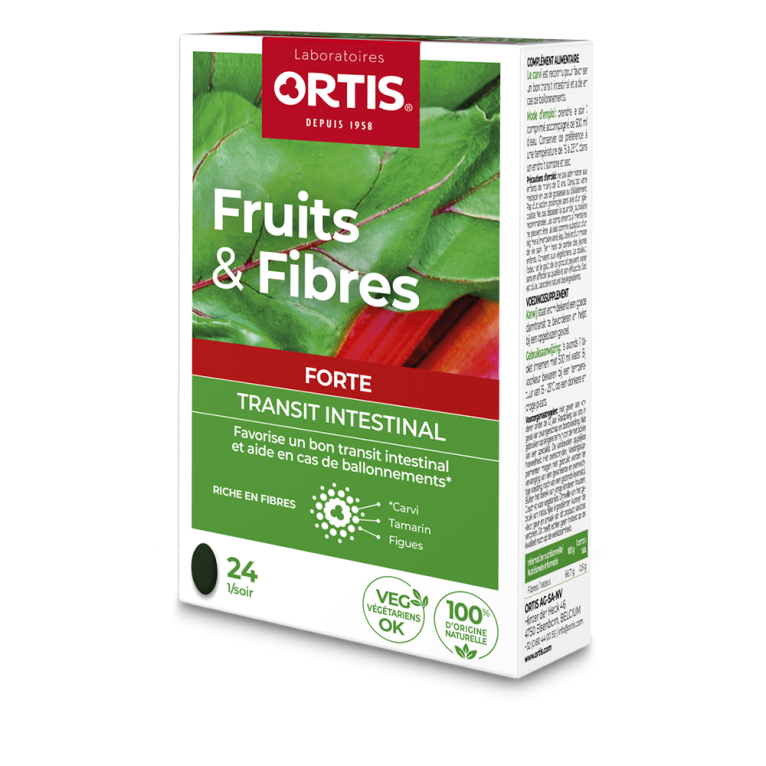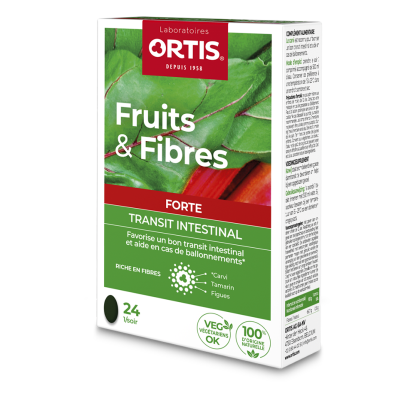 FRUITS & FIBRES Forte Transit Intestinal d’ORTIS Action Rapide est un complément alimentaire en comprimés, spécialement conçus à base de rhubarbe qui aide à favoriser un transit intestinal régulier, et de carvi qui aide en cas de ballonnements. Du tamarin et des figues sont également rajouté à la composition de ce complément alimentaire qui est adapté pour les végétariens.