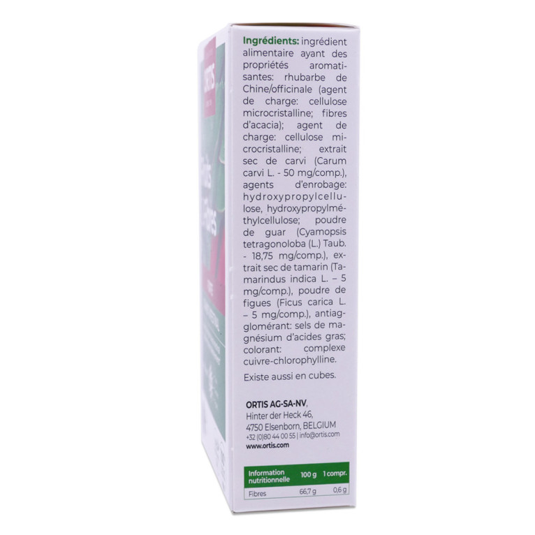 Complément alimentaire à base d'extrait sec de rhubarbe standardisé en rhéine (Rheum palmatum L./Rheum officinale Baillon; agent de charge: cellulose microcristalline; fibres d’acacia – 633 mg /comp.); agent de charge : cellulose microcristalline; extrait sec de carvi (Carum carvi L. - 50 mg/comp.); poudre de guar (Cyamopsis tetragonoloba (L.) Taub. - 18,6 mg/comp.); agents d’enrobage: hydroxypropylcellulose, hydroxypropylméthylcellulose; antiagglomérant: stéarate de magnésium; extrait sec de tamarin (Tamarindus indica L. – 5 mg / comp.); poudre de figues (Ficus carica L. – 5 mg/comp.); colorant: complexe cuivre-chlorophylline.