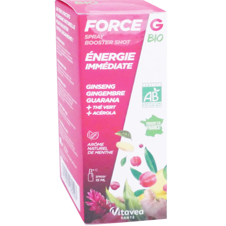 Force G Energie Immédiate de NUTRISANTE est un complément alimentaire sous forme de spray buccal au goût de menthe , 100% naturel, sans conservateur et sans colorant composé de Ginseng bio qui aide a soutenir la vigilance et la vitalité, de guarana, naturellement riche en caféine, qui participe au soutien de la vivacité intellectuelle et à la réduction de la fatigue mentale et d’Acérola Bio source de vitamine C qui contribue à réduire la fatigue. Force G Booster Shot Bio en spray contient également du gingembre bio et du thé vert. Toute une synergie de Plantes pour accompagner votre organisme au quotidien.