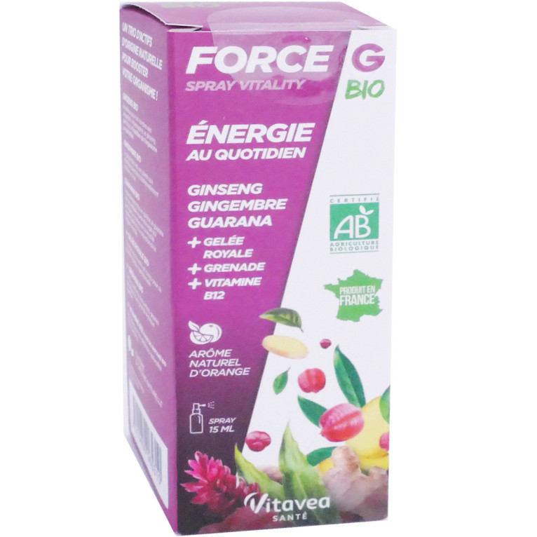 Force G Spray Vitality BIO Énergie au quotidien à prix discount des Laboratoires NUTRISANTE, le complément alimentaire bio à l'arôme naturel d'orange et à base de Ginseng, Gingembre, Guarana, gelée royale, grenade et vitamine B12, dans votre parapharmacie en ligne à prix discount.