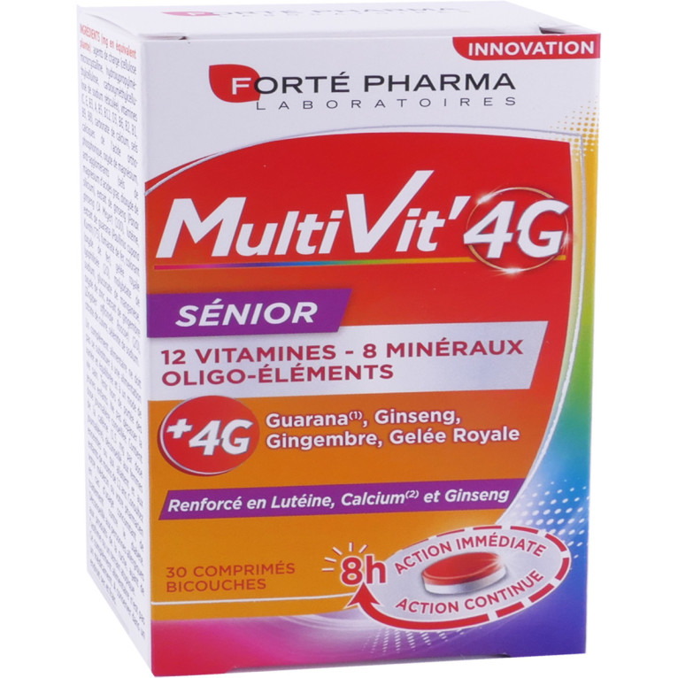 Multivit’4G SENIORS discount de Forte pharma, le complément alimentaire aux 12 vitamines, 8 minéraux et oligoéléments, avec de la Lutéine, du Calcium, et du Ginseng dans votre parapharmacie en ligne à prix discount