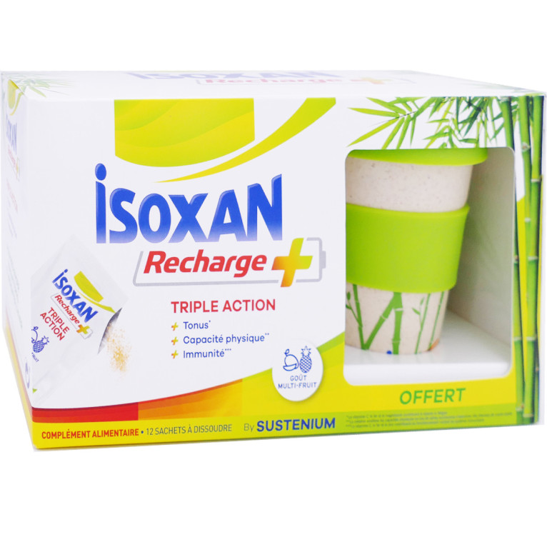 Isoxan Recharge+ Triple Action à prix discount, un complément alimentaire à dissoudre goût multifruit à base de vitamines et minéraux dans votre parapharmacie en ligne à prix discount. Mug en bambou Offert
