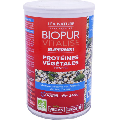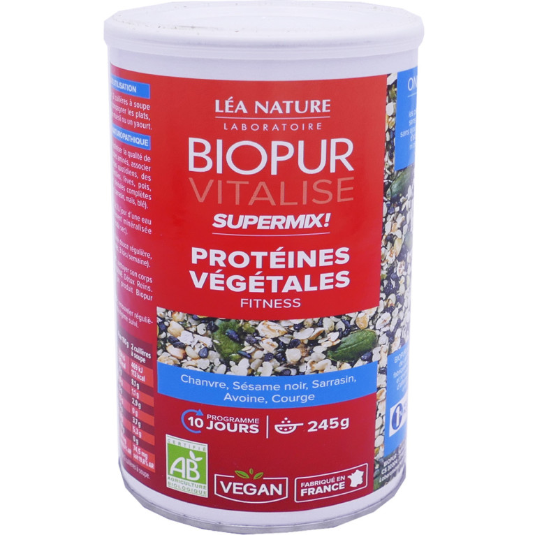 BIOPUR Vitalise Supermix Protéines végétales des laboratoires LEA NATURE discount, un complément alimentaire en poudre aux extraits naturels dans votre parapharmacie en ligne à prix discount, destiné aux personnes ne voulant pas consommer d’aliments d’origine animale, pour favoriser le maintien de la vitalité de l’organisme et redonner de l’énergie en cas de fatigue.