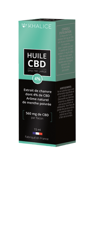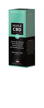 Khalice Huile CBD 4% est une préparation liquide formulée à base d'extrait de chanvre obtenu par extraction au CO2 et aromatisée à l'huile essentielle de menthe poivrée.