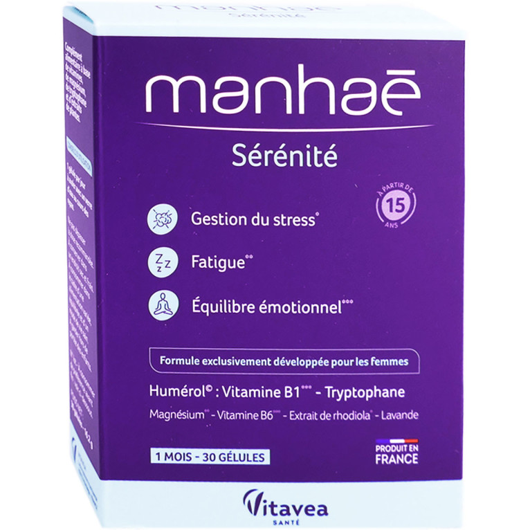 MANHAE Sérénité discount des Laboratoires NUTRISANTE, une réponse aux besoins physiques et émotionnels dans votre parapharmacie en ligne à prix discount, dans un complément alimentaire à base de vitamines, magnésium, tryptophane et extraits de plantes.