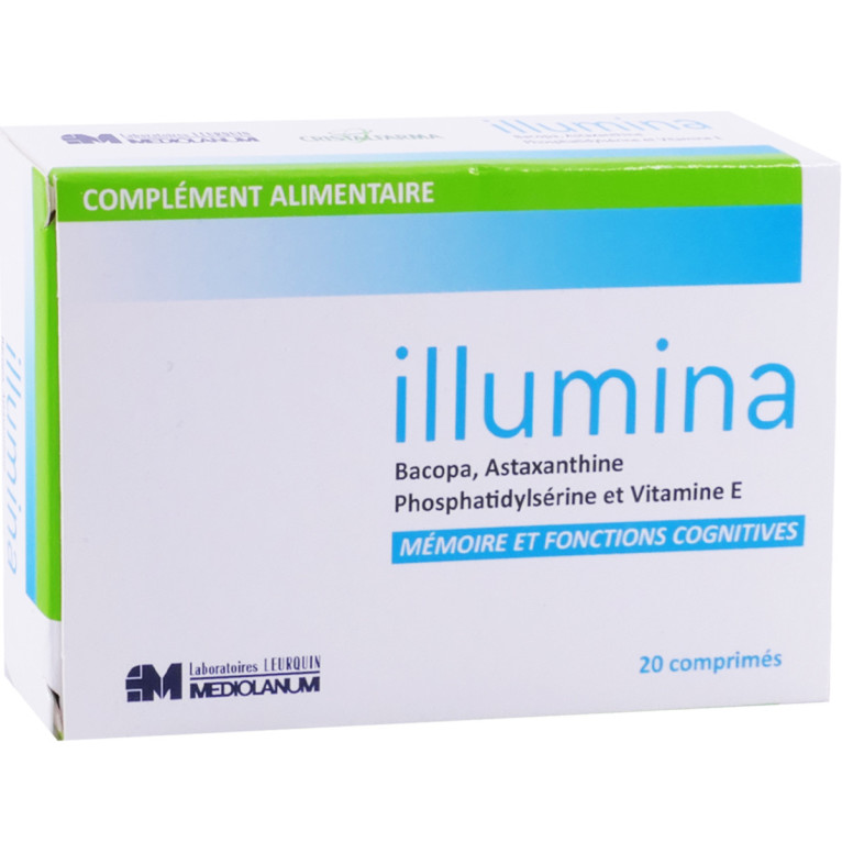 ILLUMINA Mémoire et Fonctions cognitives des laboratoires Leurquin médiolanum à prix discount , un complément alimentaire naturel dans votre parapharmacie en ligne à prix discount, à base de Bacopa, Astaxanthine, Phosphatidylsérine et Vitamine E.
