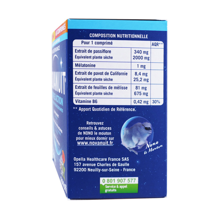 NOVANUIT Triple action est un complément alimentaire sous forme de comprimés qui contient de la mélatonine hormone du sommeil, sécrétée naturellement par le cerveau, et des extraits de plantes 100% d’origine végétale comme la passiflore, le pavot de Californie et la mélisse pour des actions sur l’endormissement, la diminution des réveils nocturnes et le sommeil réparateur. La mélatonine, à un dosage de 1mg favorise un sommeil normal et participe à s'endormir de façon naturelle. De plus, la mélisse et le pavot de Californie participent à améliorer la qualité du sommeil. La passiflore s’associe à la formule pour favoriser un sommeil réparateur. Ce complément alimentaire permet par sa technologie de libération de libérer 5 fois plus rapidement la mélatonine par rapport à l’ancien comprimé NOVANUIT. Sans accoutumance ni dépendance.