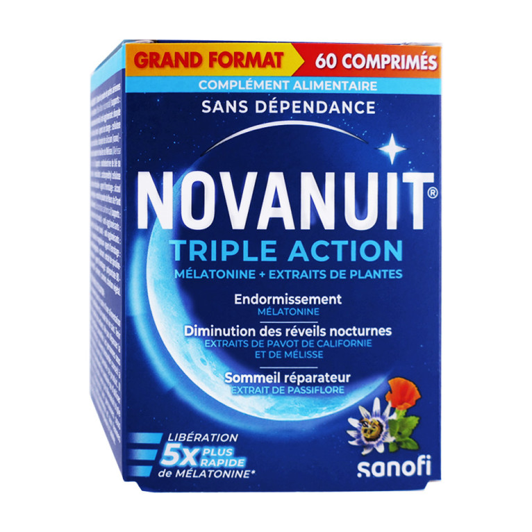 NOVANUIT Triple Action de SANOFI AVENTIS, le complément alimentaire à base de mélatonine et extraits de plantes pour une triple action sur le sommeil, dans votre parapharmacie en ligne à prix discount.